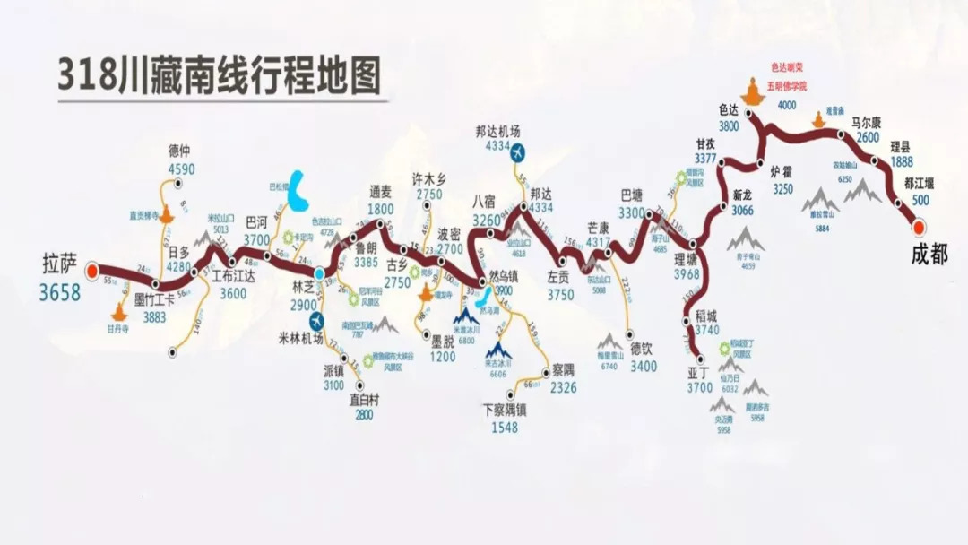 而川藏线又分南北两线,我们说的川藏线其实是南线,仅仅是318国道的一部分,从成都出发,经过康定、理塘、巴塘、芒康、左贡、林芝,最后到达拉萨