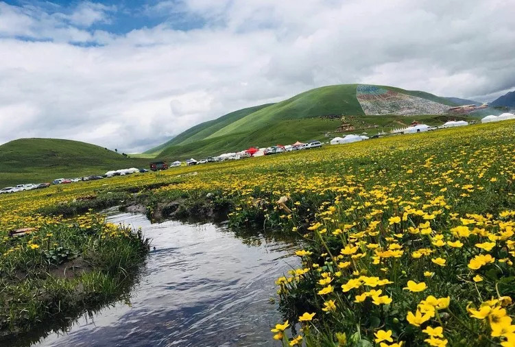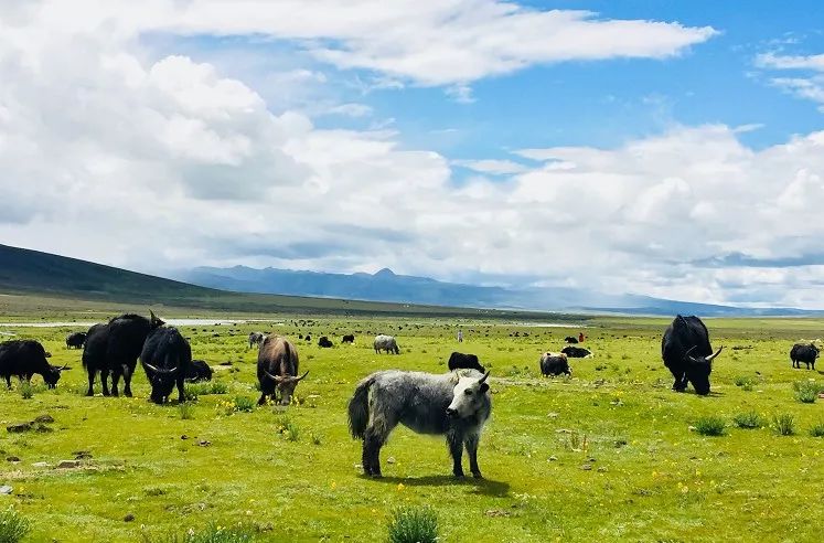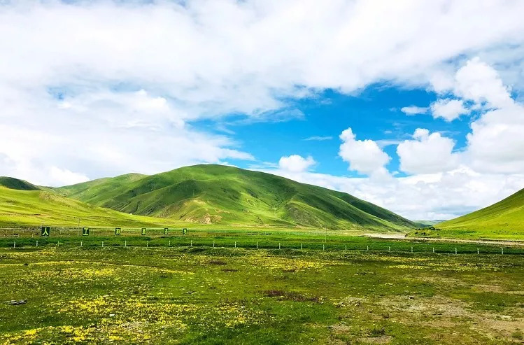 蔚蓝的天空、连绵的山峦、无垠的草甸、潺潺的溪流、山坡上觅食的牛羊、远处散落的藏族村寨、说是人间天堂,一点也不过分