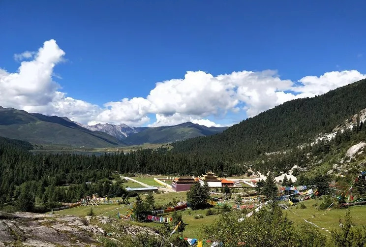驱车行驶在去往措普沟的路上,顺着湖边而行,幽静的原始森林中坐落着铜环澄亮的藏地庙宇,目光所及之处皆是整齐飘扬的五彩经幡